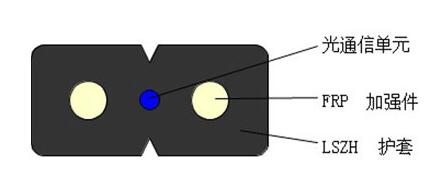 接入網用蝶形引入室內光纜是將光通信單元處于中心,兩側放置兩根平行非金屬加強元件(FRP),最后,擠制黑色或彩色低煙無鹵護套成纜。